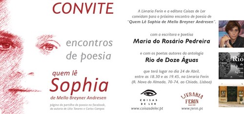 Tendemos a tornar nossos amigos nas redes sociais aqueles que conhecemos directa ou indirectamente, mas que cremos estarem interessados no que publicamos ou darem-nos material de leitura agradável. E, depois, há também um sem-número de entidades colectivas às quais nos associamos em virtude das afinidades que sentimos (é, pelo menos, o meu caso). Há já muito tempo fiz-me «amiga» de um grupo no Facebook que dá pelo nome de Quem lê Sophia de Mello Breyner Andresen, grupo esse com numerosos membros que, já se sabe, gostam da poesia de Sophia e da de outros poetas portugueses, que divulgam de forma militante. Não pensava que iria um dia conhecer os responsáveis por essa página, mas eles apareceram há uns meses no lançamento da minha Poesia Reunida e apresentaram-se. De algum tempo a esta parte, organizam uma sessão mensal com um poeta na Livraria Férin, em Lisboa, e convidaram-me para estar presente hoje às 18h30 (sucedo a Maria Teresa Horta, pas mal). Como recusar uma conversa com quem gosta de poesia?