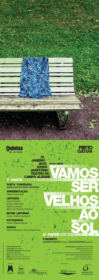 Já aqui falei mais de uma vez de um projecto maravilhoso que envolve poesia na cidade do Porto – e hoje é sobretudo aos leitores do Porto (e arredores) que dirijo este post. João Gesta, fantástico programador no Teatro do Campo Alegre, inventou há anos as Quintas de Leitura, que são dos mais bem-sucedidos eventos culturais que conheço, e – graças a deus – nunca mais desistiu delas. Uma quinta-feira por mês, há um espectáculo dedicado a um poeta com um livro lançado no ano anterior e, desta feita, coube-me a sorte de ser a convidada. No dia 31 de Janeiro, estarei, assim, no Teatro do Campo Alegre, numa sala com lotação para 300 pessoas (que medo...), a conversar com valter hugo mãe no início e, a seguir, a ler poemas ao lado de diseurs profissionais que tornam as nossas palavras mais bonitas. Mas não é tudo. As imagens projectadas no ecrã enquanto dura a conversa são belíssimas fotografias de Pedro Teixeira Neves que se casam com os poemas na perfeição – e haverá, ainda na primeira parte, um momento de guitarra e outro de dança. Depois do intervalo, quando eu já me tiver descontraído do sufoco que é estar em palco, Júlio Resende sentar-se-á ao piano ao lado da fadista Aldina Duarte, para quem já escrevi letras, e esse será seguramente um dos pontos altos da noite. As reservas de bilhetes já começaram (e diz-me João Gesta que mais de metade da sala está preenchida). Sei que prometi um lançamento no Porto da Poesia Reunida quando tivesse disponibilidade, mas haverá melhor lançamento do que este?