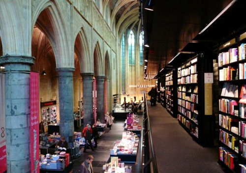 Leio num artigo da Internet que quarenta e quatro por cento dos holandeses são ateus. Existem vinte e oito por cento de católicos (que são a maioria dos crentes), dezanove por cento de protestantes, cinco por cento de muçulmanos e os restantes quatro por cento pertencem a outros credos e seitas. Porém, a maioria dos não ateus frequenta muito pouco a igreja e os outros locais de culto, sobretudo os católicos que, ao que parece, desde que Bento XVI fez um discurso homofóbico que os deixou de cabelos em pé, se zangaram e desistiram de ir à missa. Resultado: as instituições religiosas deixaram de ter fundos para manter os seus belos edifícios (sem fiéis e sem esmolas ficou difícil) e tiveram de alienar alguns deles, que se tornaram bares, cafés, livrarias e até salas de concerto. Em Amsterdão, por exemplo, uma igreja do século XIX transformou-se num templo de música pop e rock muito badalado, e em Maastricht outra belíssima igreja deu lugar à livraria Selexyz, uma das mais belas do mundo, cuja fotografia deixo aqui em baixo. Talvez esta transformação signifique o fim de uma época, mas não é mau que haja templos tão belos para o livro.